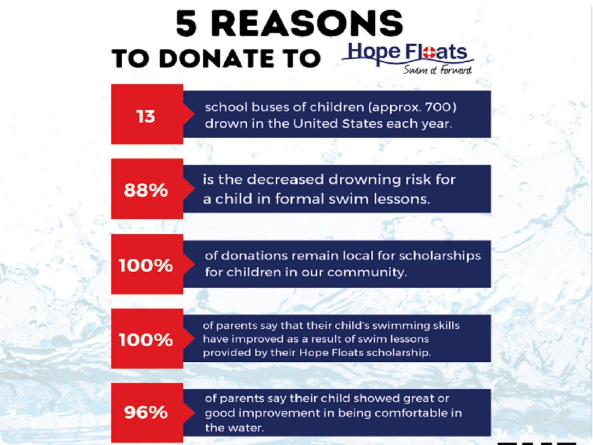Hope Floats raises money by partnering with individuals, businesses, and foundations that want to be a force for good in their communities. Scholarships and tuition assistance is provided to children who might not otherwise be able to afford swim lessons. Join SwimBranson in supporting this lifesaving cause today!